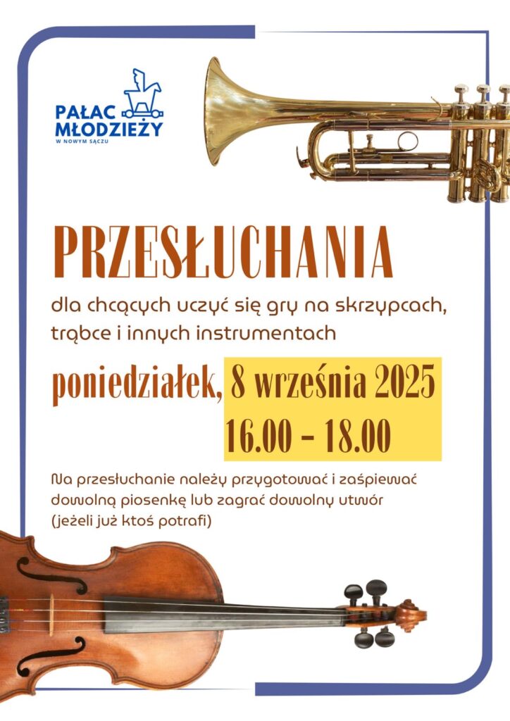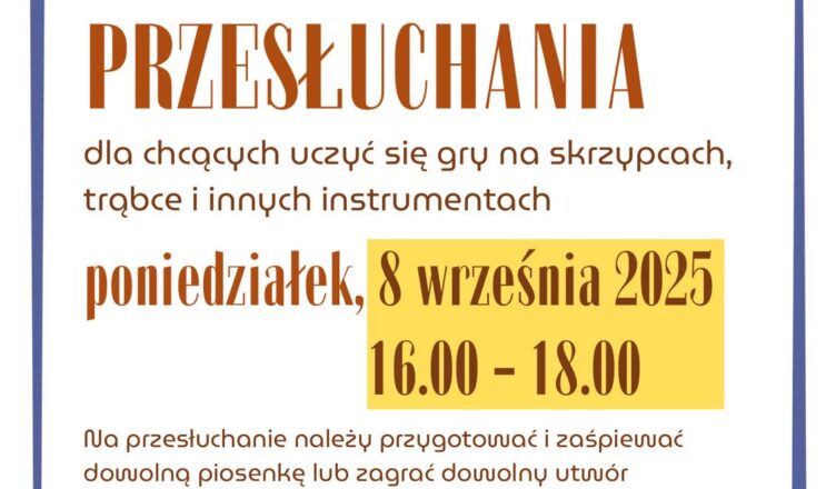 Wszystkich chętnych, którzy chcą rozpocząć lub kontynuować naukę gry na instrumentach, m.in. skrzypcach i trąbce, zapraszamy na przesłuchania, które odbędą się 8 września 2025 roku w godzinach 16:00–18:00, w sali muzycznej (nr 11) na I piętrze.