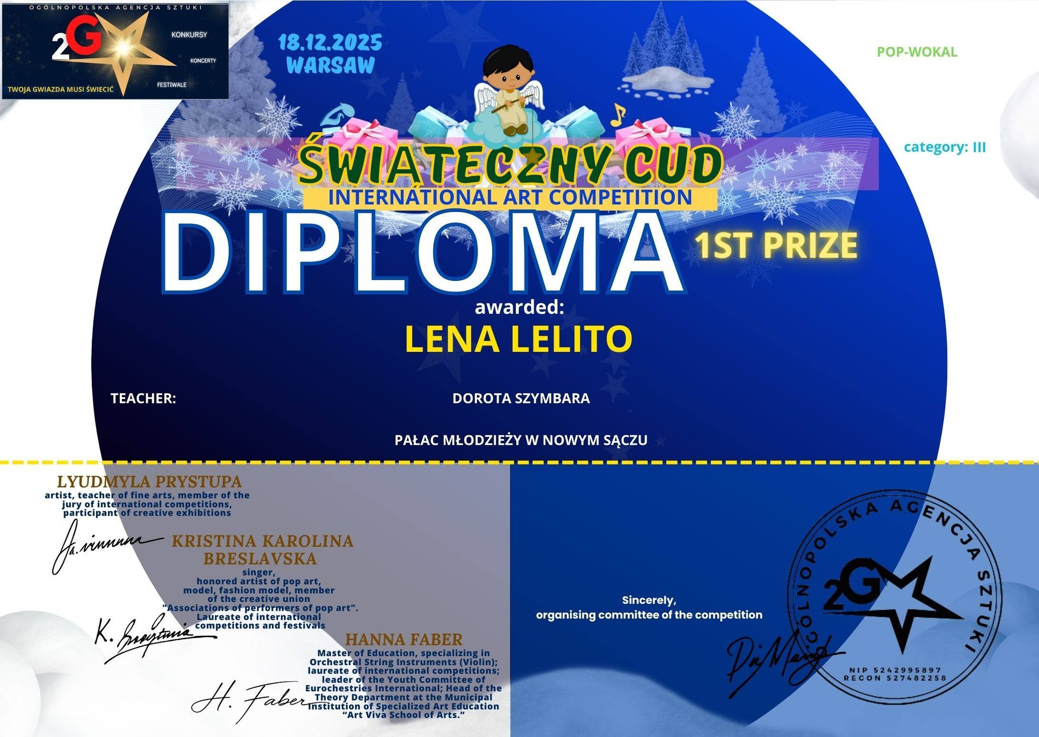 5 stycznia 2026 roku w magicznej, świątecznej atmosferze odbył się Międzynarodowy Konkurs Sztuki „Świąteczny cud”, który przyniósł Lenie Lelito najwyższe miejsce w kategorii wokalnej.