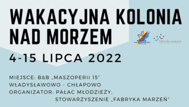 Stowarzyszenie „Fabryka Marzeń” i Pałac Młodzieży zapraszają na wspólny wyjazd wakacyjny w pierwszej połowie lipca. Oprócz zwiedzania atrakcji polskiego wybrzeża podczas trwania kolonii na uczestników czekają warsztaty